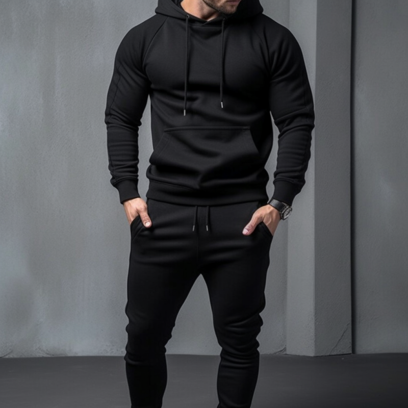 Poate exista o ușoară diferență de nuanță a culorii negre între trening și hanorac.