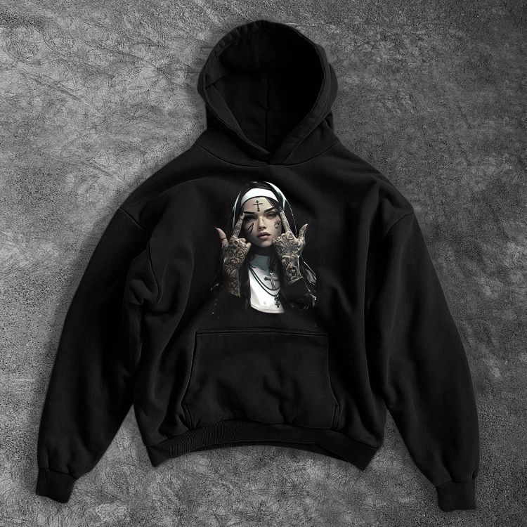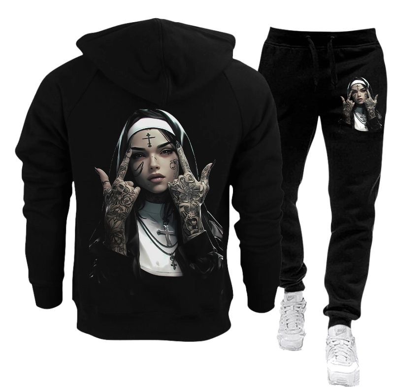 Poate exista o ușoară diferență de nuanță a culorii negre între trening și hanorac.
